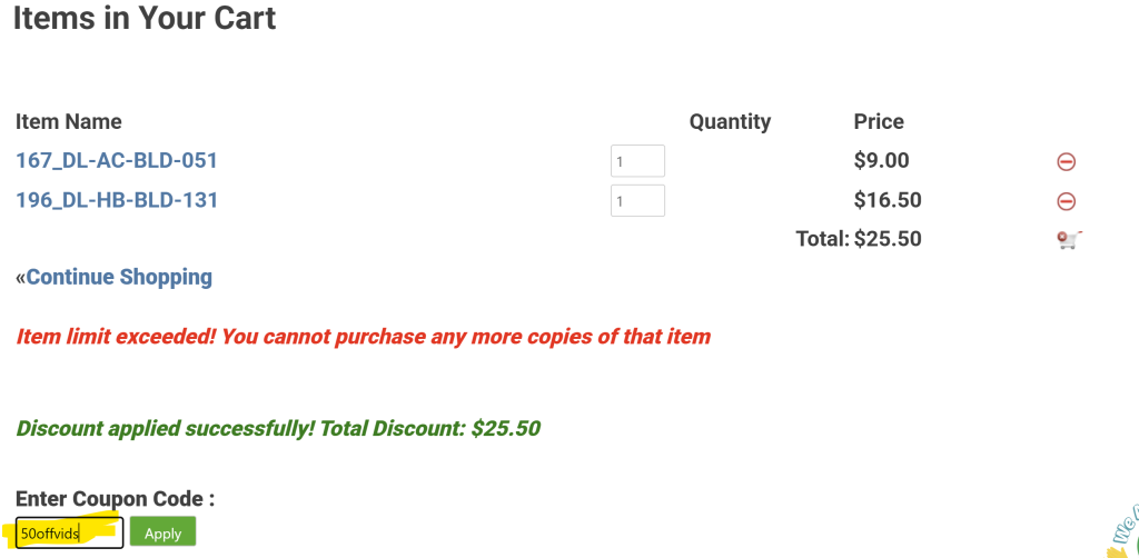 #3) Receive additional 50% off on any sale videos (usually on page 2, 3, 4, 5…) when you add exact two copies to shopping cart and manually input coupon code – “50offvids” before you check out (Total 70-85% off as a VIP)