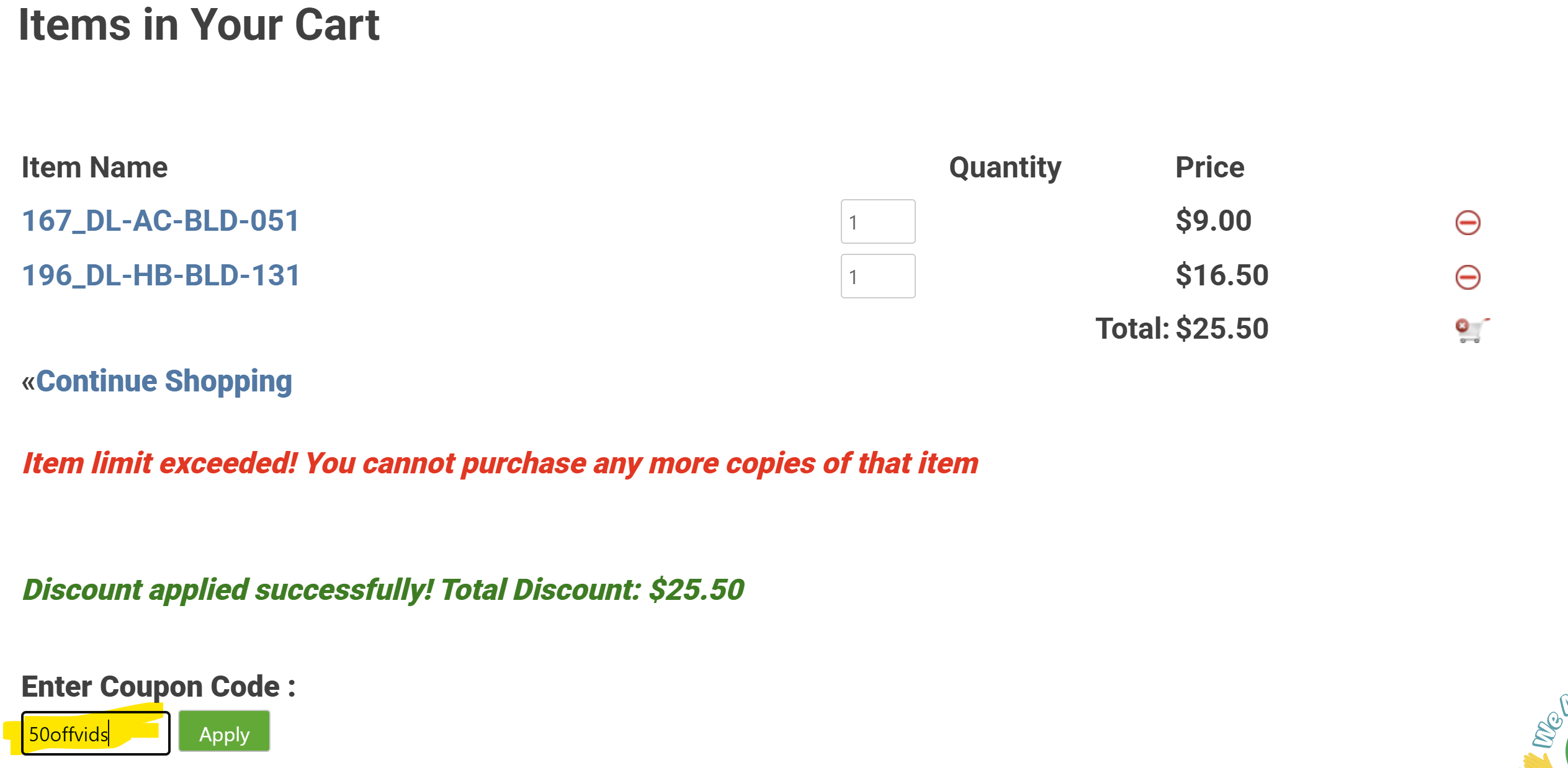 Please simply pick any 2 on sale videos at a time that you are interested, then manually input “50offvids” code before you check out.